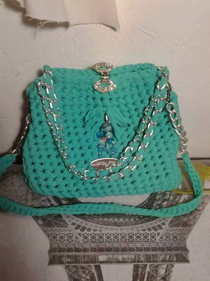 Mod. Stella realizzata a punto stella in fettuccia color petrolio e manici catena con fettuccia inserita, marchio in plexiglas Foderata con cerniera Euro 30